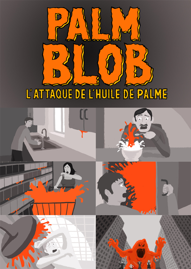 I chose the subject of palm oil. Its culture and industrialisation is a problem for many reasons (for example massive deforestation). Its systematic utilisation in industrial products (food ou cosmetics) create an omnipresent but too much underestimated problem.The purpose is to inform on this subject and its dangers. To create interest and avoid guilt, I chose an offbeat point of view by personify palm oil in a Blob (in homage to the 1958 movie). By amplifying it, the danger becomes concrete.