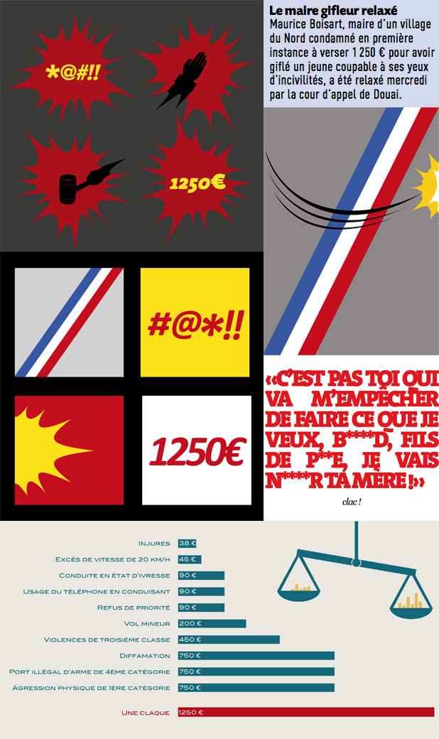 Graphisme d’information à partir d’un article de journal sur d'un maire ayant claqué un jeune qui l'avait insulté.