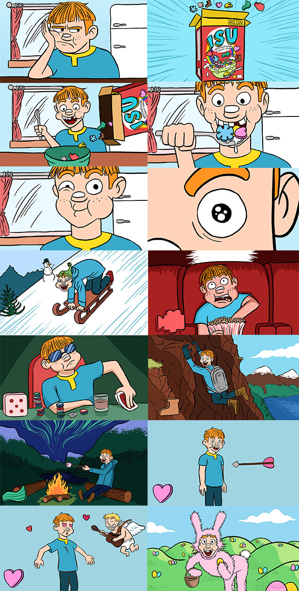 Unfinished animation for International Student Union of Volda. The animation was to present the different activities of the association by parody an old school cereal commercial (each activity being a flavor).